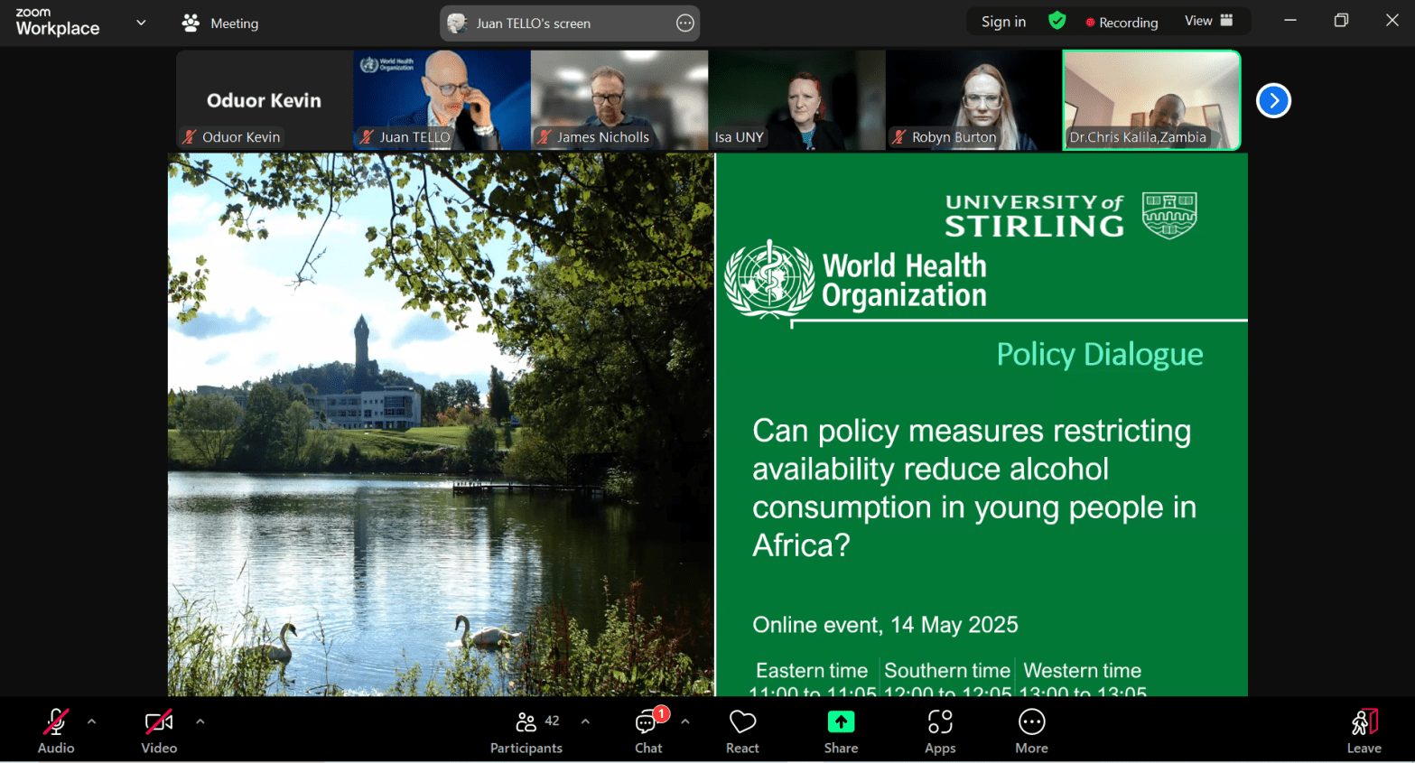 Today [14th May 2025], I had the opportunity to participate in a thought-provoking alcohol policy dialogue for the Africa region titled “Can policy measures restricting availability reduce alcohol consumption in young people in Africa?” The event was co-organized by the University of Stirling (UK) and the World Health Organization’s Less Alcohol Unit, and brought together leading public health experts, researchers, and advocates from across the continent.