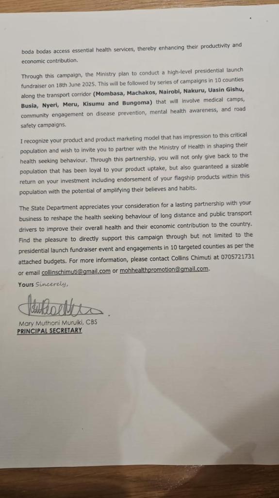 In the letter dated 7th May 2025 and addressed to BAT Kenya Managing Director Crispin Achola, the Ministry (or someone impersonating it) writes: